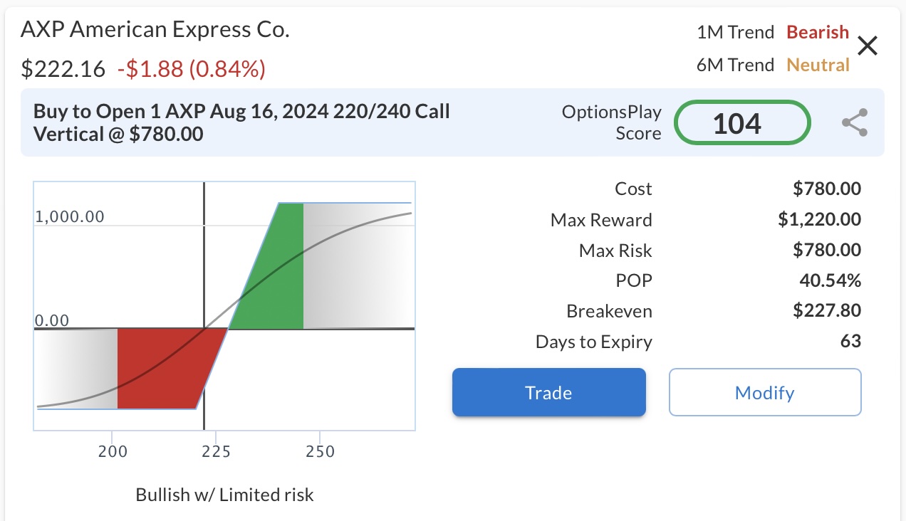 This strategy would risk $780 per contract if AXP is below $220 at expiration, while potentially profiting $1,220 per contract if AXP rallies above $240 at expiration (see below).