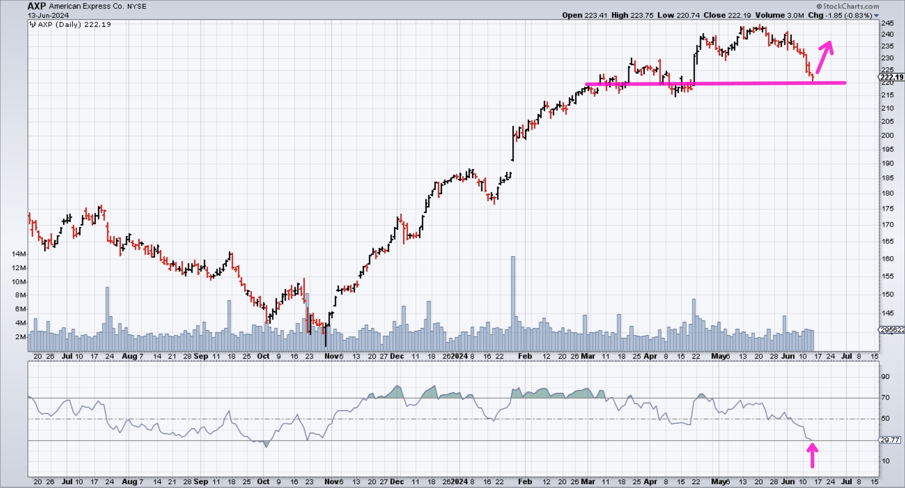 CHART 1. DAILY CHART OF AMERICAN EXPRESS. The RSI is oversold, presenting a more attractive risk/reward scenario for adding long exposure.Chart source: StockCharts.com. For educational purposes.