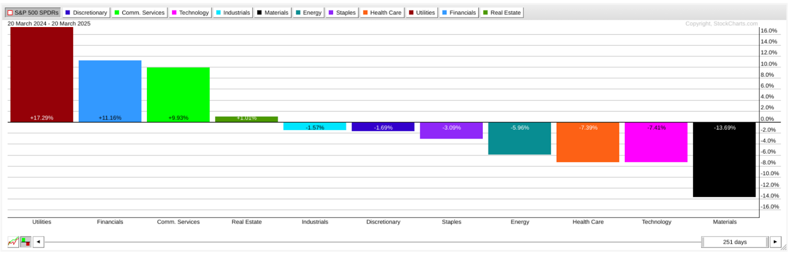 PerfCharts show that over the past year, Utilities, Financials, and Communications Services have led the market, while Materials, Technology, and Health Care have lagged. If you were looking to shift your portfolio toward greater sector diversification, this chart would prompt a few questions: