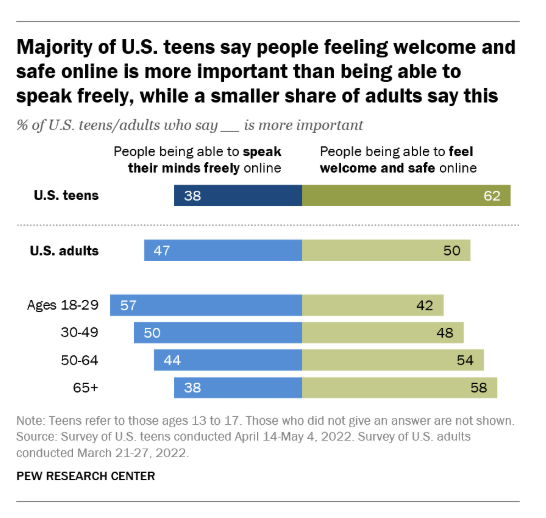According to a 2022 Pew survey, 50 percent of American adults believed that “People being able to feel welcome and safe online” was more important than “People being able to speak their minds freely online.”
