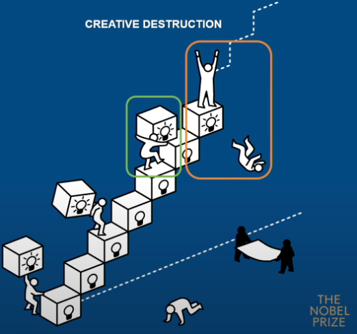 To illustrate, consider their metaphorical “innovation ladder.” Firms climb this ladder by investing in R&D, while others fall off as new technologies render them obsolete. The process is painful but necessary: without turnover, there is stagnation. Importantly, in societies with well-functioning institutions that secure property rights, foster open markets, and provide a safety net that enables risk-taking, firms that fall can get up again after they’ve been knocked down. In such systems, failure is not terminal; it is part of the learning cycle.