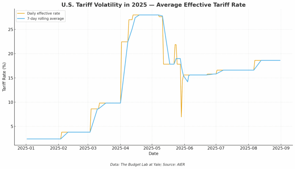 Copper alone is instructive. The administration slapped on a 50 percent tariff, sending shockwaves through markets, then quietly rolled it back —although not without consequences. This is trade policy drafted as if by people who’ve never managed a balance sheet, let alone understand the basics of margins and managerial accounting. For anyone watching, the episode was a case study: threats move markets, tariffs impose costs, and then political calculation intervenes to soften or reverse course. The volatility of the average effective tariff rates since April 2 are erratic enough to attribute to rudderless, arbitrary choices — the mark of policymakers lurching from headline to headline, not executing a coherent economic plan.