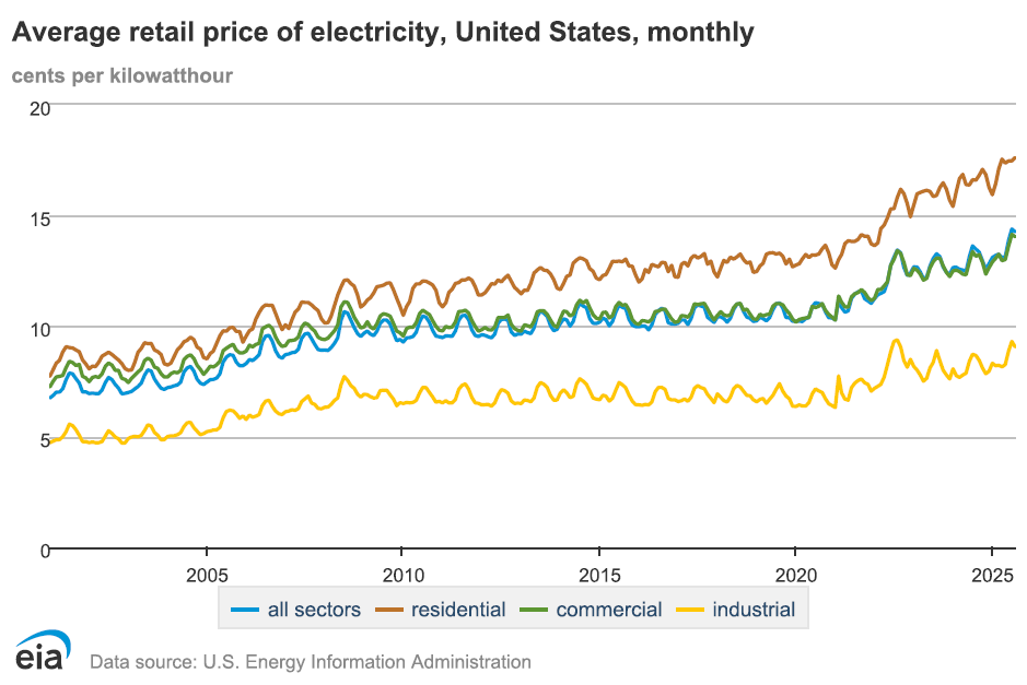 Energy inflation tells the tale. Headline prices are running hotter than the 2 percent target, and the pressure points are concentrated in utilities. Electricity alone is up roughly 5 percent, and utility gas is up close to 12 percent versus a year ago. Average retail electricity prices have jumped nearly 9 percent already this year. The burden isn’t uniform. North Dakotans pay the lower energy costs, around 11.7¢ per kWh with a typical bill near $112, while Hawaiians pay roughly 42.3¢ and a $203 monthly tab. That gulf largely reflects system design and policy. North Dakota sits on abundant generation with strong ties to the Midcontinent grid; Hawaii is an islanded system importing fuel and equipment with layers of costs. When transmission is constrained and hardware is expensive, consumers pay.