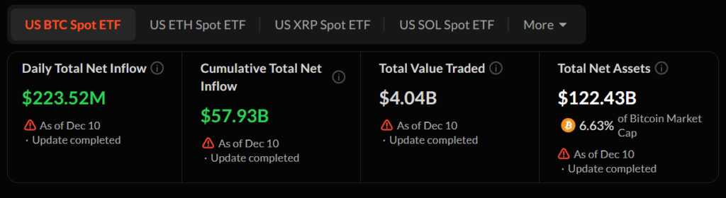 Also, Ethereum funds performed well on December 10, extending their winning streak to three days with $57.6 million ETF inflows.