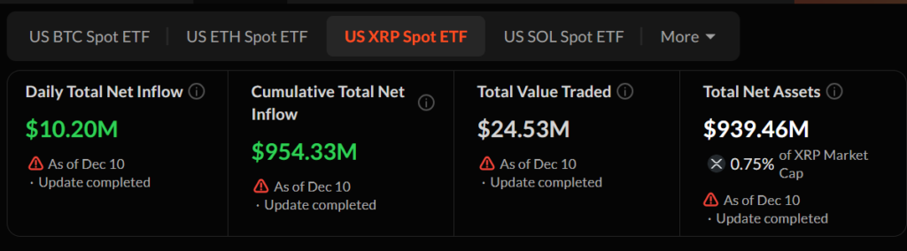 New altcoin exchange-traded funds have thrived in recent sessions. Beyond Bitcoin and Ethereum, Solana and XRP ETFs displayed positive flows on December 10.