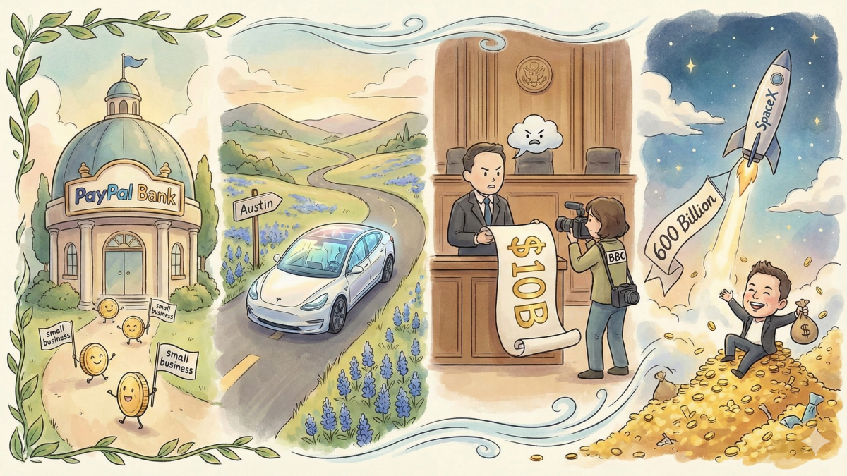 Here is your cheat sheet: PayPal is eyeing a banking charter, Tesla is testing driverless tech in Texas, and SpaceX just made Elon Musk wealthier than ever.