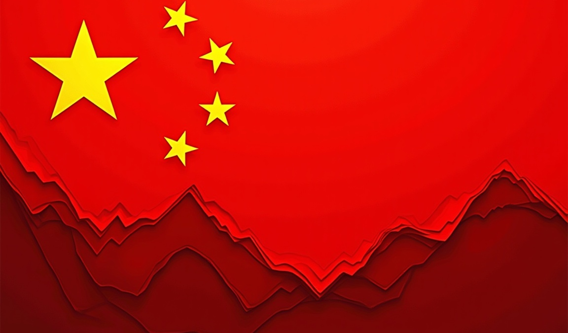 Stylized red image of China’s flag with layered downward shapes symbolizing economic decline and deflation.