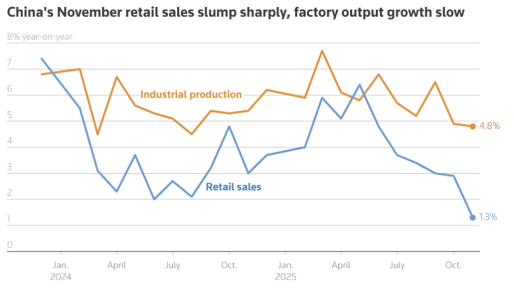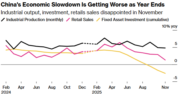 Investment used to be China’s fastest way out of trouble. Fixed asset investment fell 2.6% in the first 11 months of the year compared with the same period in 2024.