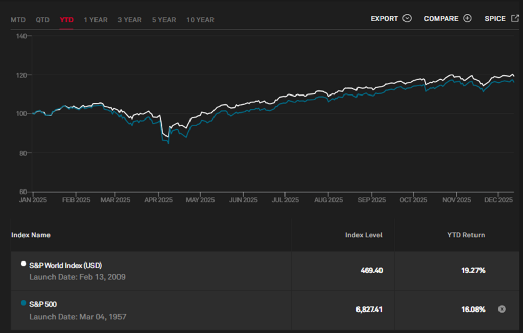 Figure 1: S&P 500 Index vs. S&P Global Index, Jan. 2025 to Dec. 2025 (source: WSJ)