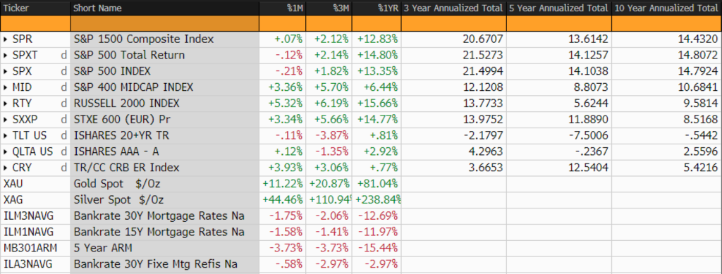 It would be remiss not to mention the astounding run in precious metals over the past thirty days, with both gold and silver posting historic gains amid mounting economic and policy uncertainty. Gold has surged to the cusp of $5,000 an ounce, driven by a powerful mix of falling real yields, fading confidence in fiat currencies, concerns over Federal Reserve independence, and sustained international central bank purchases. The rally reflects a classic “debasement trade,” as investors seek protection from expansive fiscal policy, rising debt burdens, and the perception that monetary restraint is giving way to political pressure. Silver has moved even more dramatically, breaking above $100 an ounce for the first time as haven demand collided with a structurally tight supply backdrop and speculative fervor across global retail markets. Its dual role as both an industrial input and financial asset has amplified volatility, particularly amid trade tensions, geopolitical strain, and shifting expectations around tariffs and monetary policy. Together, the moves in gold and silver underscore a broader erosion of confidence in traditional anchors — currencies, bonds, and institutions — adding a distinct financial market tailwind to the narrative of heightened uncertainty shaping the current economic environment.