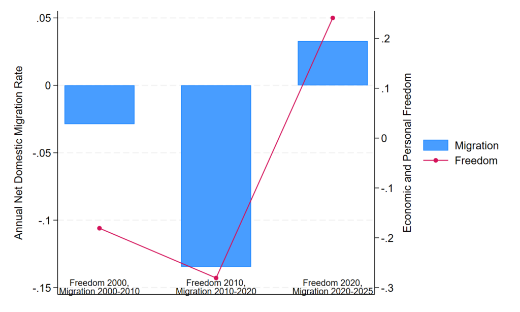 The strongest evidence might be from changes over time. West Virginia has had one of the biggest increases in freedom in recent years as a result of its partisan shift from heavily Democratic to heavily Republican. As its freedom has risen, it’s flipped from a net out-migration state to a net in-migration state (Figure 1).