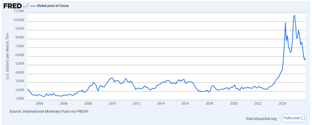 Needless to say, Côte d’Ivoire and Ghana have constructed a highly interventionist system around their most important export. Compounding these policy distortions, the 2025/26 crop season is expected to see a 10 percent fall in output due to “shifting weather patterns, ageing tree stocks, disease, and destructive small-scale gold mining.” This shortage has intensified pressure in an already volatile cocoa market. According to FRED, cocoa prices have risen by more than 70 percent in the last five years.