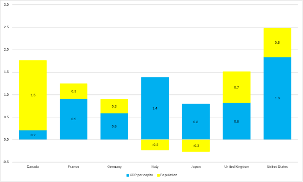 The numbers for per capita GDP growth tell a very different story. The United States is still top of the G7 with an average real per capita GDP growth rate of 1.8 percent annually. But Canada slumps from second to bottom. Fully 1.5 percentage points — 88 percent — of its 1.8 percent average annual growth in total GDP can be attributed to increases in the population. Despite impressive total GDP growth, the average Canadian has become little better off. Italy, by contrast, rises from third to second. While its population declined at an average annual rate of 0.2 percent — the second worst performance — its per capita GDP grew at an average rate of 1.4 percent annually.