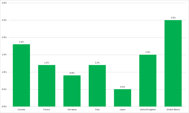 Indeed, over the last ten years, real Gross Domestic Product (GDP) growth has averaged 2.5 percent annually in the United States. This is the best performance among the G7 nations, ranking well ahead of Canada, in second place, with 1.8 percent, and Italy in third, with 1.2 percent, less than half the US rate (Figure 1).