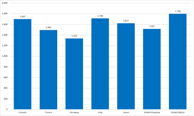 But Cowen notes that “Paul Krugman frequently put forward the argument that American and West European living standards are roughly the same, with Americans earning more but working longer hours.” And there is truth in this. American workers, on average, work longer hours than their G7 counterparts (Figure 4).