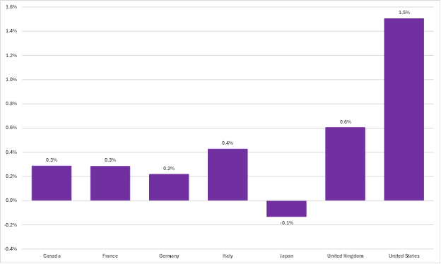 Growth in GDP per worker can be broken down into that share which comes from a worker working more hours and that which comes from a worker becoming more productive. When we break down the rates of per worker GDP growth shown above, we see, again, a different story. The United States saw a faster rate of per worker productivity growth between 2015 and 2024 than any other G7 country, more than twice the rate of Germany, in second place (Figure 5).