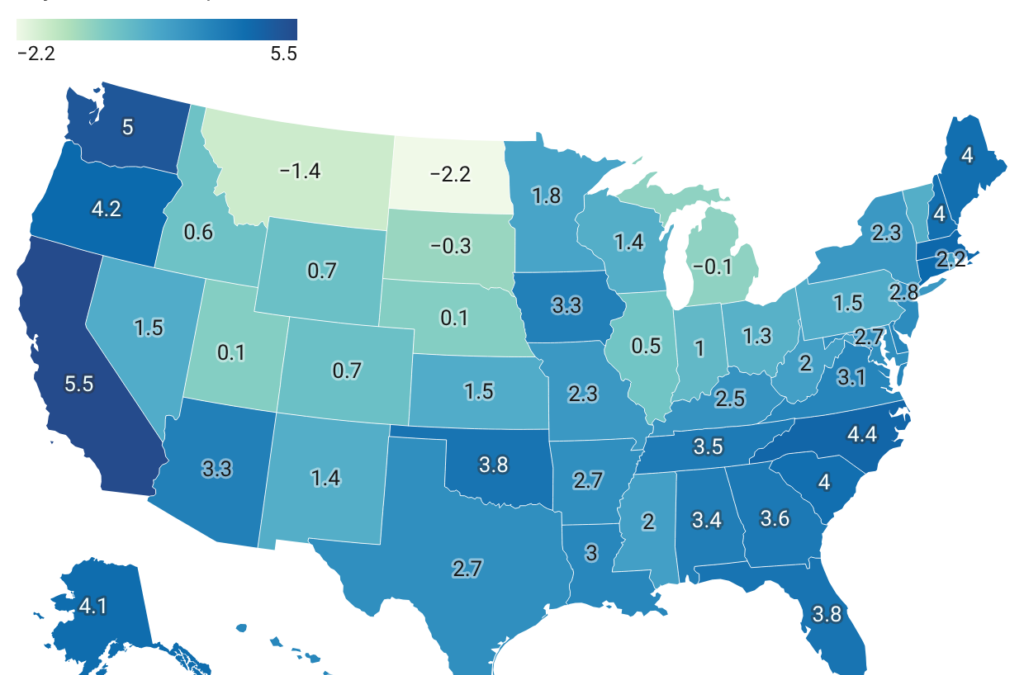 The gap between nominal and real growth rates represents inflation. But let’s map inflation on its own (Figure 3). That Massachusetts had the lowest inflation rate in the US in 2024 may be a bit of a surprise. All the Pacific states are also low, as is New Hampshire. Montana had the highest inflation in the country, followed by Idaho, Utah, and Nevada. It’s worth noting here that low-population states tend to have the biggest year-to-year swings in inflation rates. It’s not that they tend to be higher or lower, just more volatile and less predictable.