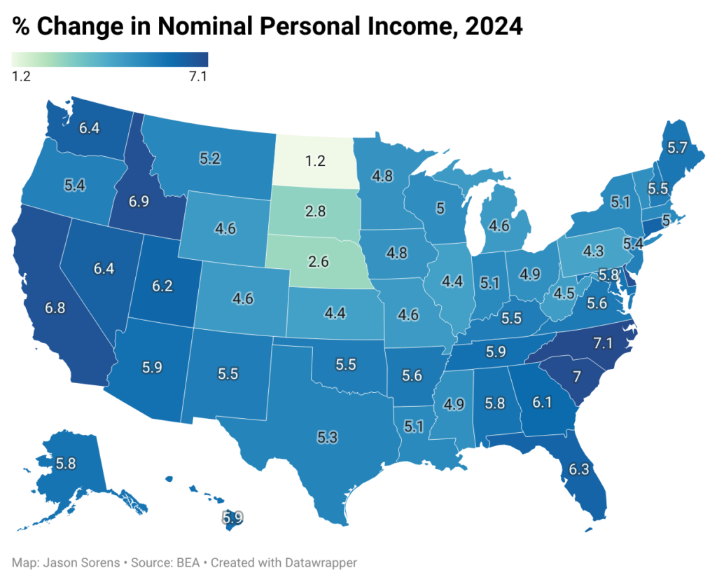 California had the third-lowest growth rate of rents in the US, after DC and Wyoming. That’s a dramatic turnaround for what is still America’s most expensive state for housing. The fact that the state maintained high nominal income growth alongside slow rental inflation implies that California’s slow rental inflation may be a result of new housing supply, rather than falling housing demand. If so, that means that the housing reforms that the state has enacted are starting to have an effect on production and rents. It’s plausible as well that the AI boom, in full swing already by 2024, had positive effects on California’s economy.