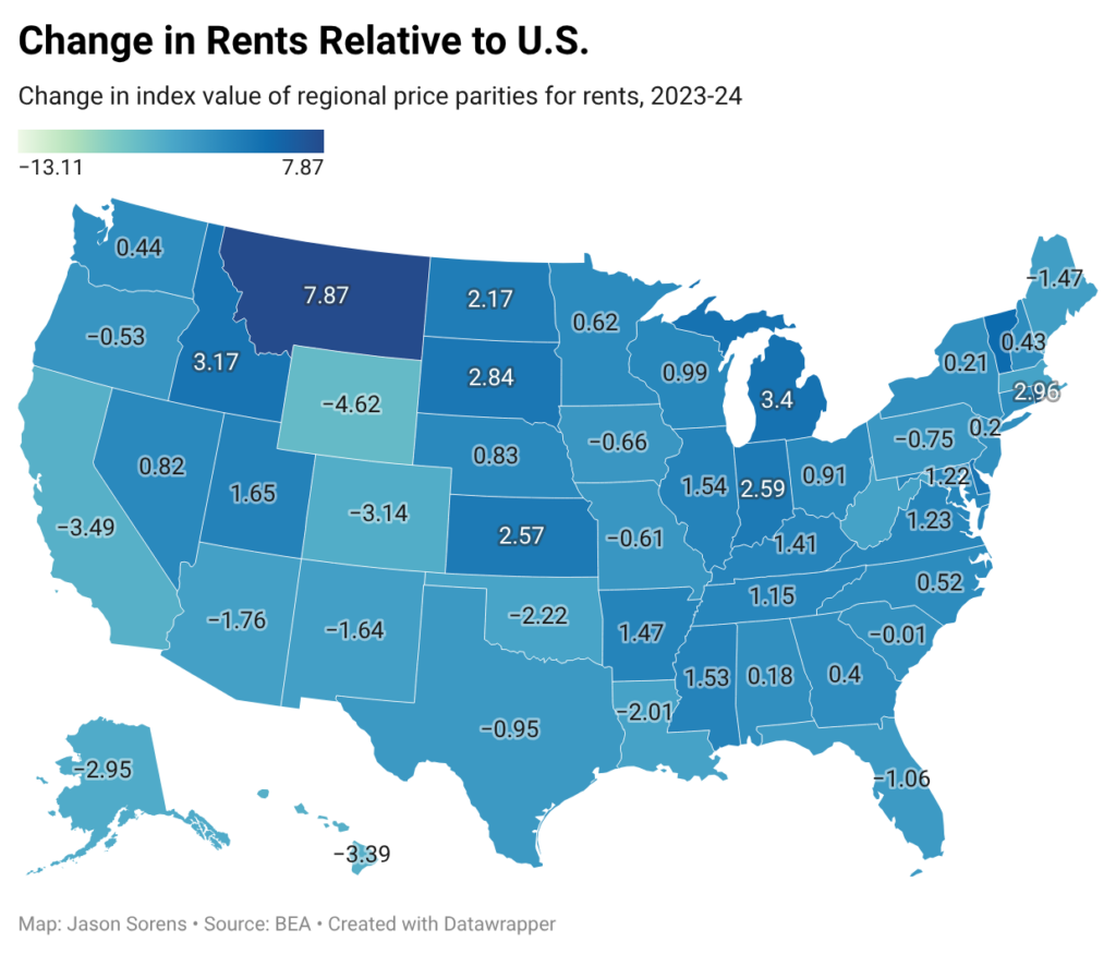 To look at the housing component specifically, I have mapped changes in state real price parities for rents in Figure 4. These numbers represent state-level change in rents relative to the US average. So a positive figure means that rents rose more rapidly in the state than in the US in 2024, and a negative figure means that rents rose more slowly in the state than in the US that year, not necessarily that they fell in absolute terms.