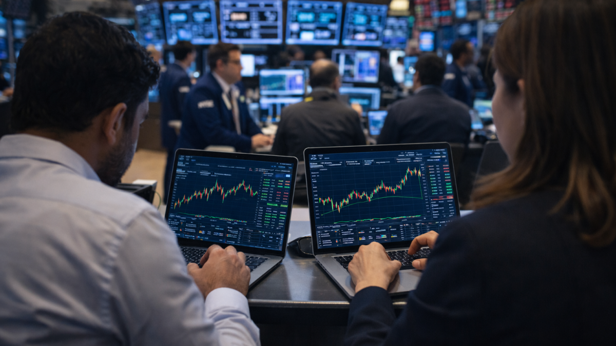 Two traders using laptops displaying stock charts on a busy trading floor with multiple market screens in the background.